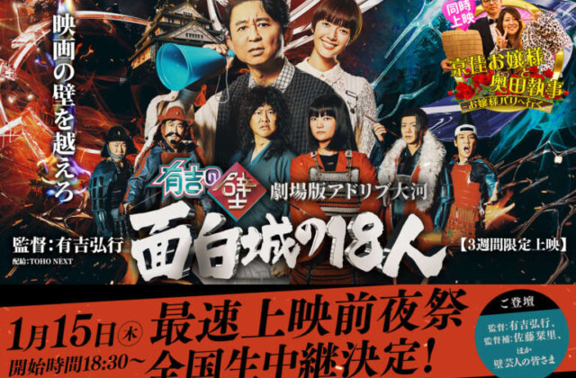 1/15(木) 『有吉の壁 劇場版アドリブ大河「面白城の18人」』最速上映前夜祭の全国生中継が決定しました。 開催日時 1月15...